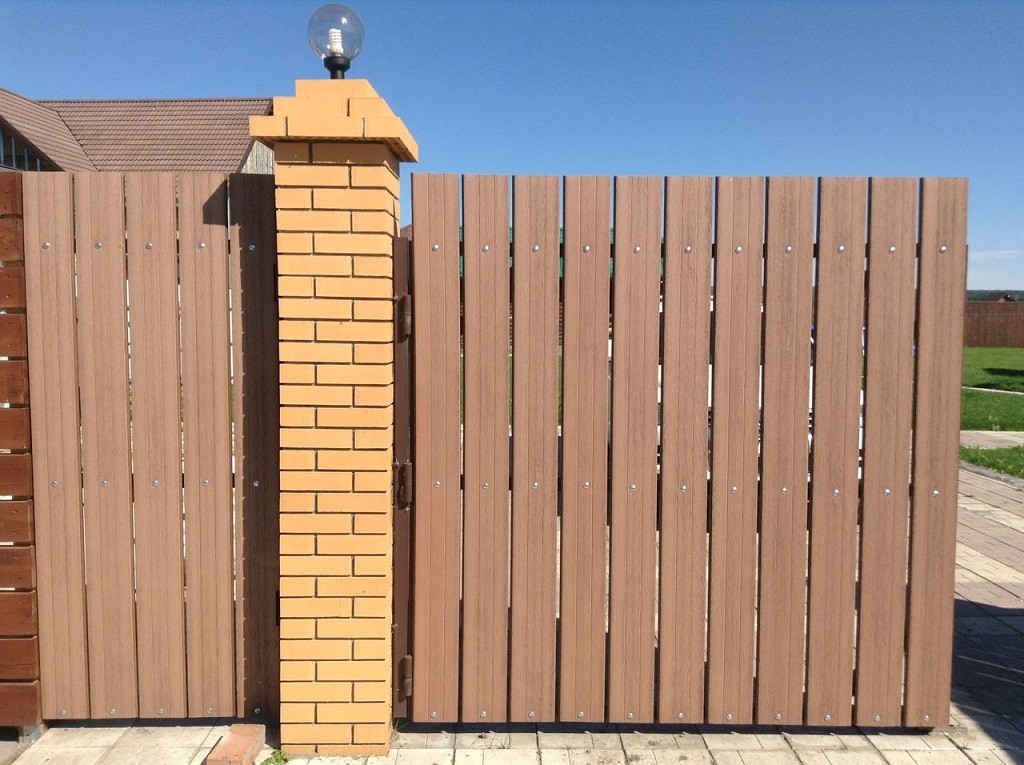В таком типе монтажа доска ДПК обычно используется как «тело забора» на рис. ниже, когда конструкция опорных столбов и колон уже выполнена из кирпича или бетона. Монтаж не составляет труда. Доска крепится на направляющие, которые обычно выполнены из профильной трубы, либо монтажной лаги из ДПК (их количество зависит от высоты заборной доски). Заборное полотно устанавливается на них с произвольным шагом на саморезы со сверлом или мебельные болты. Последние позволяют добиться отличного визуального вида такого решения.